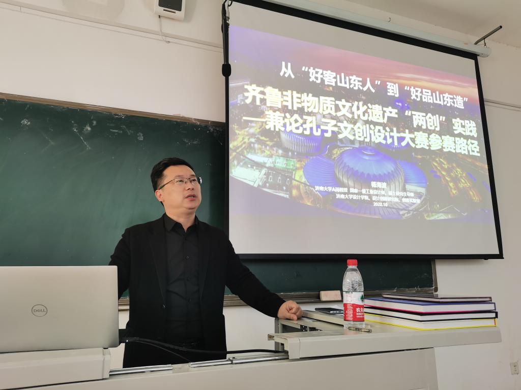 杨海波教授以《从“好客山东人”到“好品山东造”齐鲁非物质文化遗产“两创”实践——兼论孔子文创设计大赛参赛路径》为题进行了宣讲,提出大赛创作要分析生活方式,洞见创新机会。杨院长认为,孔子文化的传播不全在于孔子的外表形象,更在于孔子文化与现代社会文化的融合,从而达到文化自信。随后,杨院长结合设计项目案例,分享了自己产教融合过程中总结的设计创意方法论:六品设计(品德+作品+产品+商品+用品+再生品)与六产融合。