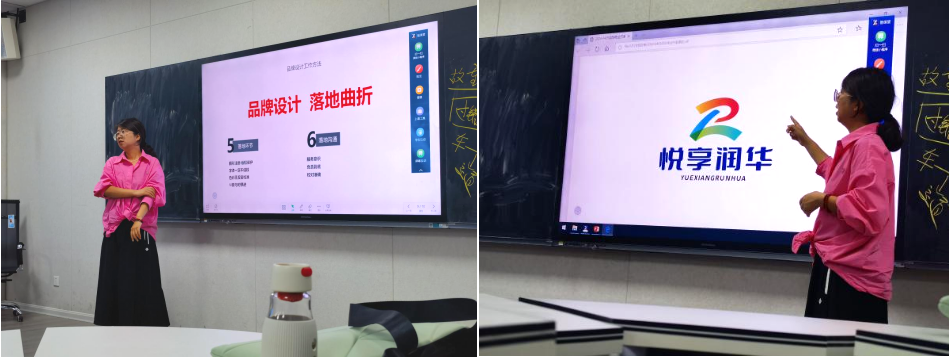 雷东丽以其丰富的实战经验,向学生们详细讲解了品牌相关知识以及如何成功构建一个品牌,在设计之前必须深入洞察市场需求,强调策略先行,思考重于执行,并且要有足够的耐心面对品牌落地过程中的各种挑战。最后雷东丽通过近期的公司项目——大观齐鲁(齐鲁文旅品牌策划)、润华物业品牌设计等案例与同学们进行了详细分享,使同学们不仅了解到了项目的落地、行业的动态,更见识到了品牌建设的操作流程和细节处理。