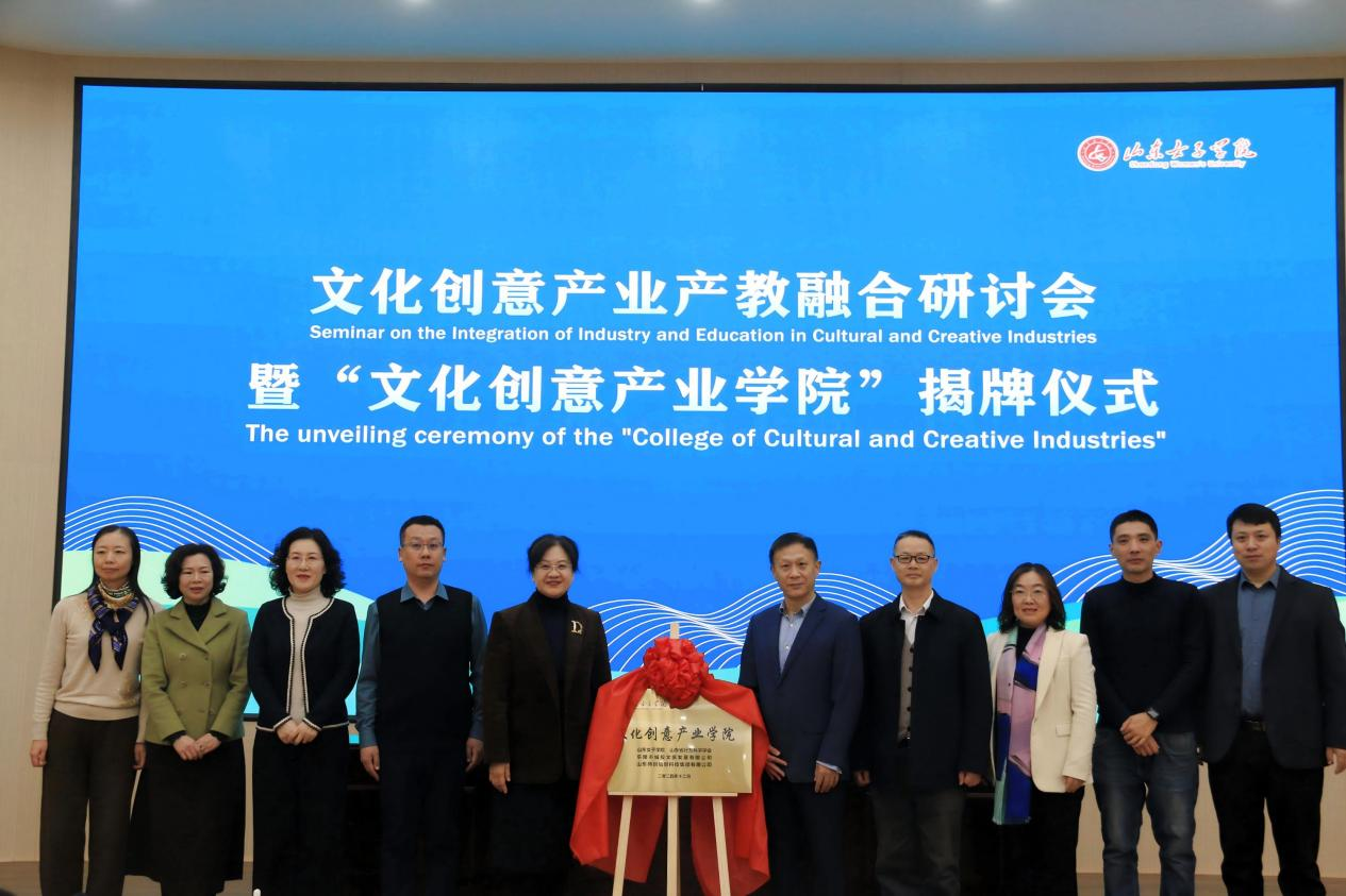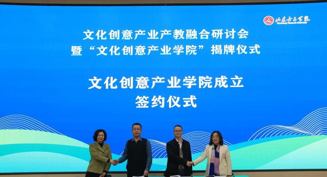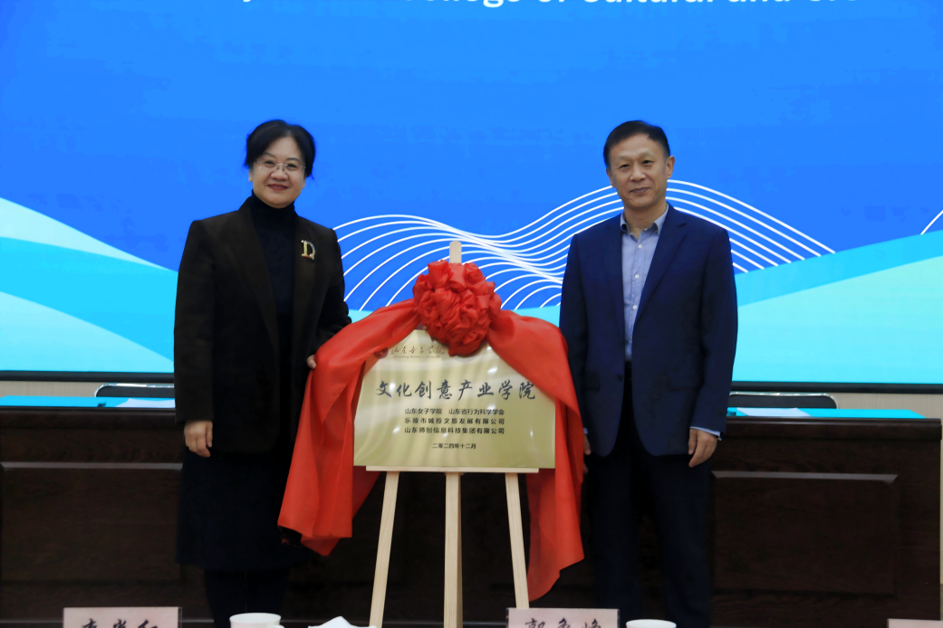 在国家大力重视并积极推动文化创意产业的大背景下,山东女子学院积极响应国家创新驱动发展战略,全力投身于培养能够适应并引领现代产业发展的高素质应用型、复合型、创新型人才的事业之中。2024年12月20日上午,山东女子学院携手山东省行为科学学会、乐陵市城投文旅发展有限公司及山东师创信息科技集团有限公司,举办文化创意产业产教融合研讨会暨“文化创意产业学院”揭牌仪式。