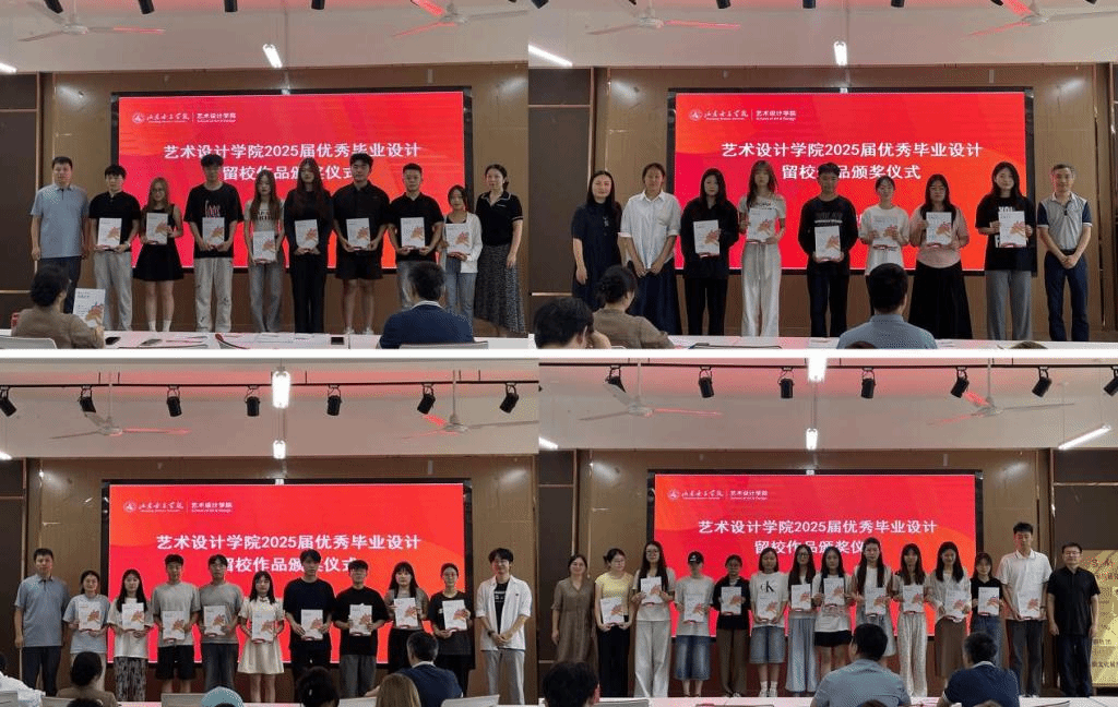 仪式现场,叶小华宣读留校收藏作品名单,学院领导、专业负责人共同为创作者颁收藏证书。本次留校作品聚焦社会热点与文化传承,体现了“设计服务社会”的理念,留校作品将用于教学成果展示与学科建设,部分作品还将被推荐参加学科竞赛。本次活动既是毕业季的重要环节,也是学院“以展促教、以藏促学”特色的生动实践。