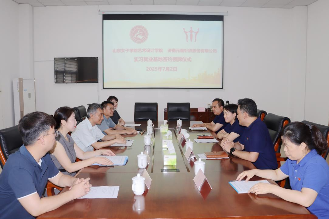 为深化校企合作,拓宽学生就业渠道,2025年7月2日下午,山东女子学院艺术设计学院党委副书记叶小华、副院长赵崇立一行赴济南元首针织股份有限公司开展访企拓岗活动,并举行“实习就业基地”签约授牌仪式。济南元首针织股份有限公司党委副书记明建建、副总经理徐洪武等企业领导出席活动。