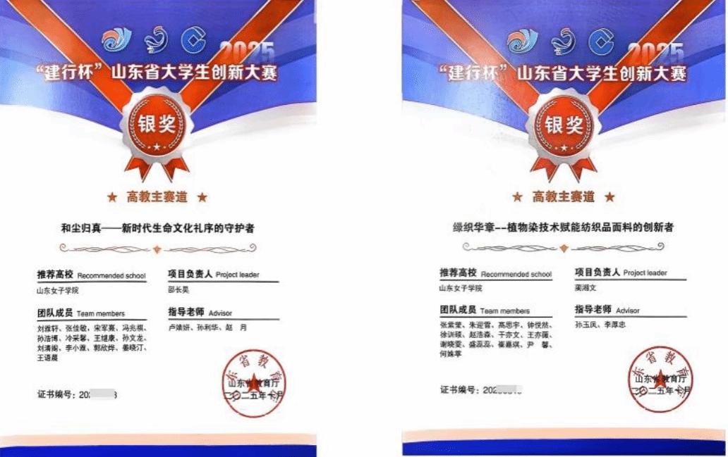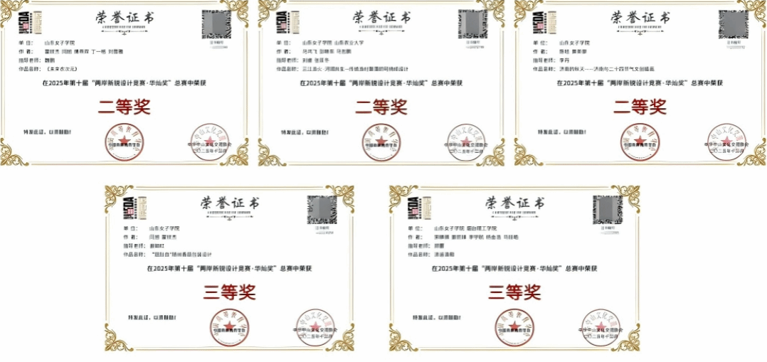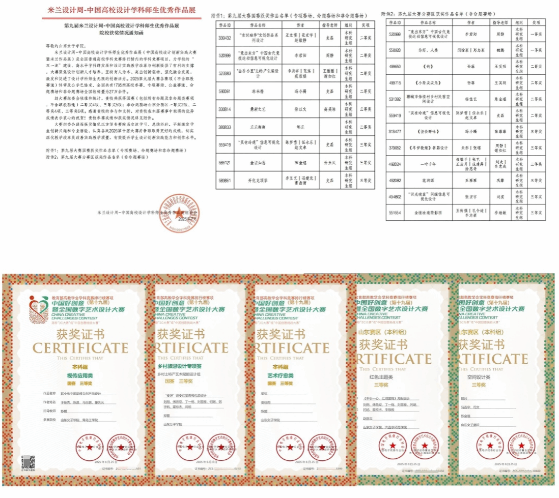 在中国国际大学生创新大赛山东赛区选拔赛中,学院师生团队经过激烈角逐,最终荣获“三银一铜”的优异成绩,并强势入围全国总决赛。在第十届两岸新锐设计竞赛·华灿奖国赛中,学生作品荣获二等奖3项、三等奖2项,位居省内同类高校前列。在山东省第七届高校美术与设计专业师生基本功展示活动中,学院师生获教师组二等奖4项、三等奖1项,学生组二等奖2项、三等奖4项。此外,在全国大学生广告艺术大赛、米兰设计周-中国高校设计学科师生优秀作品展、未来设计师·全国高校数字艺术设计大赛(NCDA)等赛事中,学院师生亦有多项作品获奖,全面体现了学院扎实的专业育人基础。