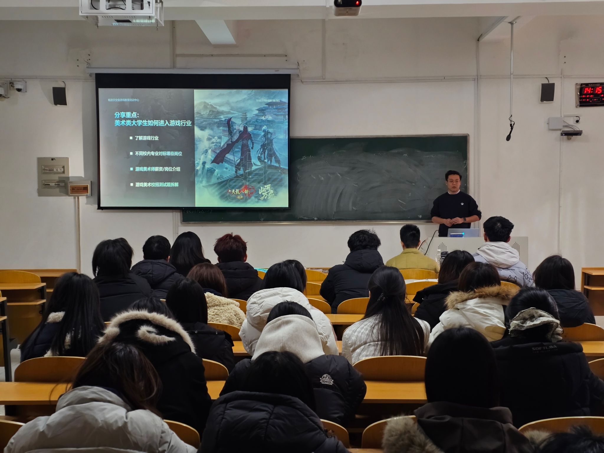 赫士聪首先分析了游戏美术行业的就业前景。他引用最新行业数据,数据显示国内游戏市场保持稳健增长,带动了美术人才需求的持续扩大。随后,他系统梳理了原画设计、三维建模、动作特效、技术美术等核心岗位的技能要求与发展路径,并介绍了腾讯、米哈游、网易等头部企业的校招流程与人才标准,为学生规划职业生涯提供了清晰参考。