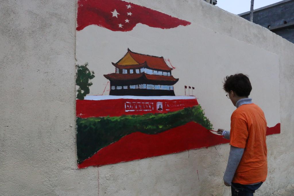 菏泽市定陶区保宁村是我校“第一书记”包扶村,今年暑期,艺术学院“美丽乡村建设”志愿服务队前往开展社会实践,帮助村民彩绘文化墙,支教留守儿童,受到了村民和孩子们的欢迎和称赞。党的十九大会议胜利召开后,第一书记带领村民修起了健身广场,建起了百姓大舞台。为了进一步宣传贯彻十九大精神,实施乡村振兴战略,志愿服务队受“第一书记”邀请和学校组织部安排,再次来到保宁村,响应村民的热情要求,以“宣传十九大精神 建设美丽乡村”为主题,发挥艺术设计专业优势,用中国画、简笔画的表现形式,结合“永远跟党走”、“振兴乡村”、“决胜小康”等十九大会议内容,分别绘制了1个10*2.3米的舞台背景墙和4个3*1.3米的文化墙。设计绘制过程中,吸引了很多村民和孩子们围观,志愿服务队的同学们一边教孩子绘画,一边与孩子们同绘一幅画,共筑中国梦。