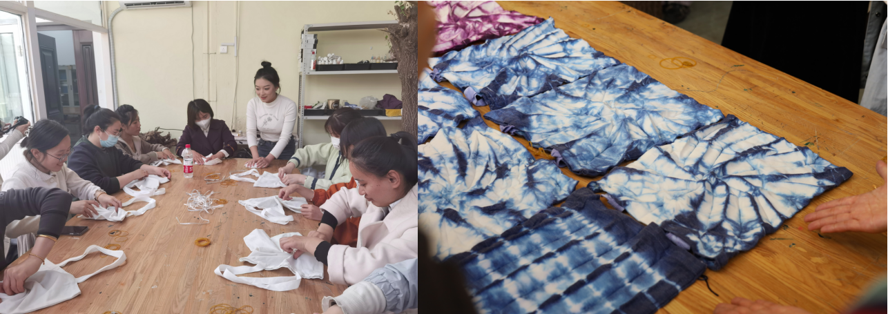 在扎染小课堂上,学生们绘声绘色的为大家讲解扎染文化,介绍非遗扎染技艺源远流长的历史和分类,并手把手地向大家传授扎染基本技艺。体验者在同学们的指导下,对着染布或扎或拔、又染又洗,通过圆形扎法、斜线扎法、米字法等扎法,亲手制作出一件件扎染创意帆布包,每一件作品都呈现出隽秀、清新、淳朴的特点。