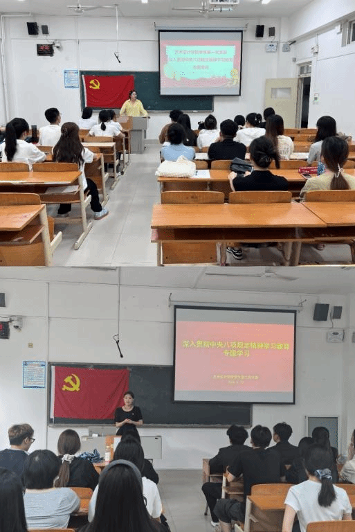 青年党员领学,践行初心使命。学生第一党支部书记窦艺菲以“慎微、慎独、慎初”为行动要求,结合《纪律处分条例》剖析“四风”问题表现,引导党员从节约水电、学术诚信等细节践行规定;学生第二党支部书记李腾号召党员将八项规定精神融入艺术创作,通过公益海报、社区文化项目传播廉洁文化,以专业实践弘扬清风正气。