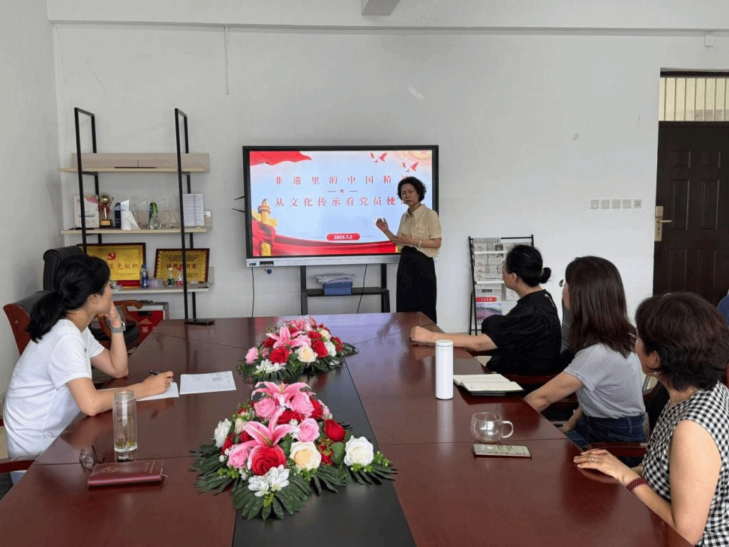 深耕文化传承,筑牢精神根基。党委委员、副院长赵月以“非遗里的中国精神:从文化传承看党员使命”为题,从非遗中的家国情怀、工匠精神、民族智慧切入,系统阐释文化传承的党员责任。她强调,党员需在非遗保护宣传、传承创新及实践活动中发挥先锋作用,并结合省文化创新奖申报工作,部署成果梳理与目标规划,推动非遗文化与艺术设计专业深度融合。