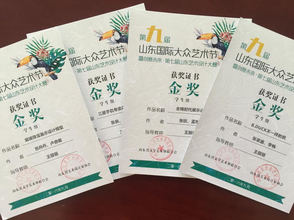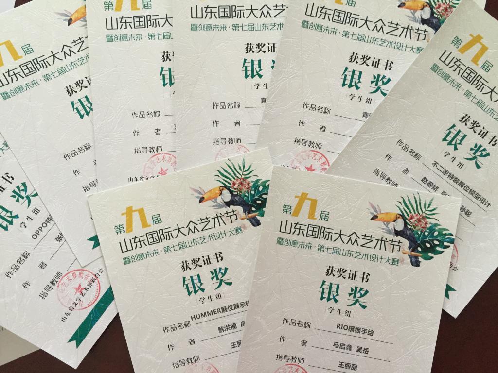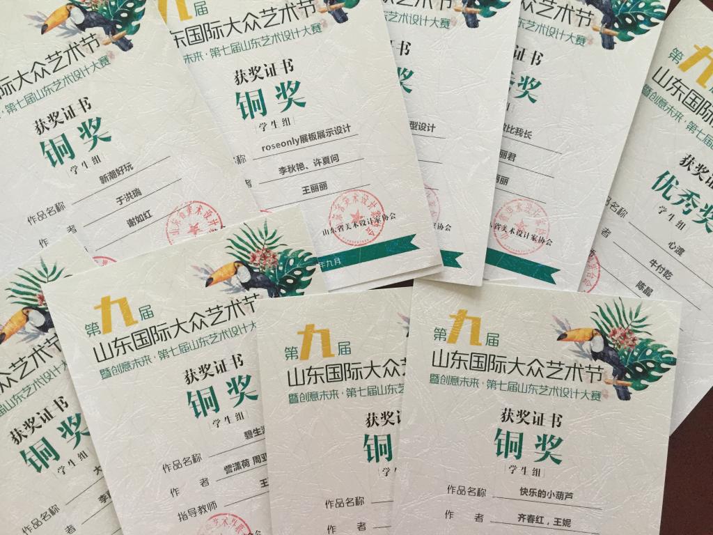 在刚刚结束的第九届山东国际大众艺术节暨创意未来·第七届山东艺术设计大赛上,山东女子学院艺术学院学生取得丰硕成果,共获得金奖4项,银奖9项,铜奖10项。