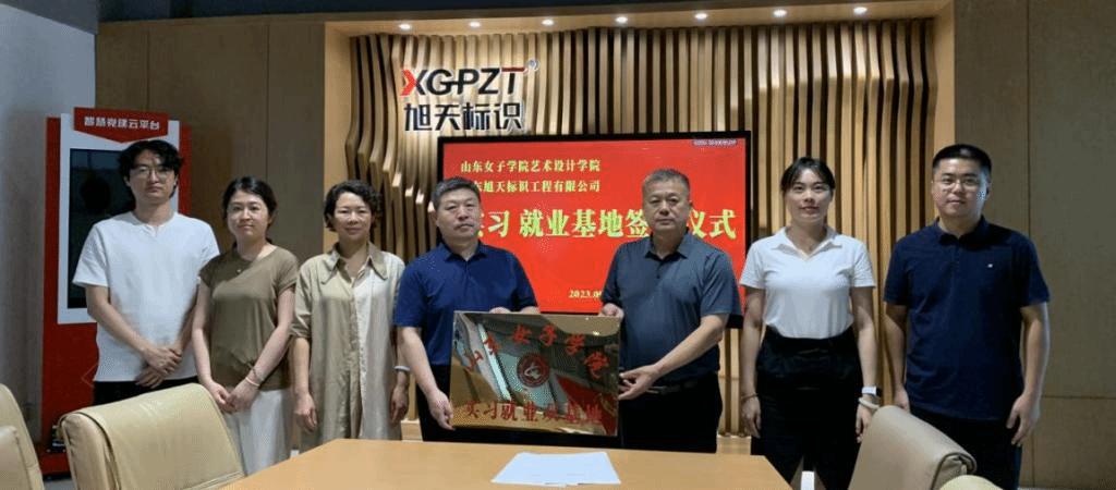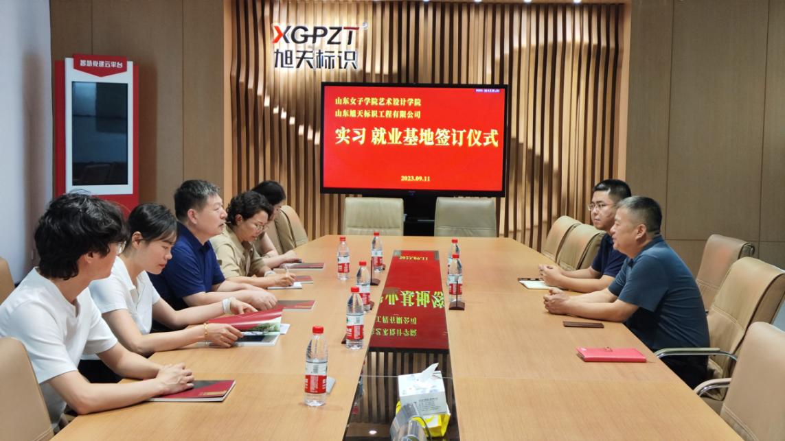 9月11日下午,我院与山东旭天标识工程有限公司签订实习就业双基地协议并举行授牌仪式。山东女子学院艺术设计学院党委书记董玉新、副院长赵月、院长助理李月、环境设计教研室主任崔珊、数字媒体艺术教研室主任魏鹏,山东旭天标识工程有限公司董事长王波、设计总监钱磊参加了签约仪式。