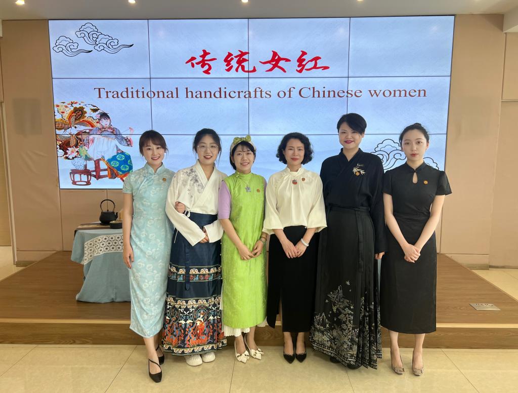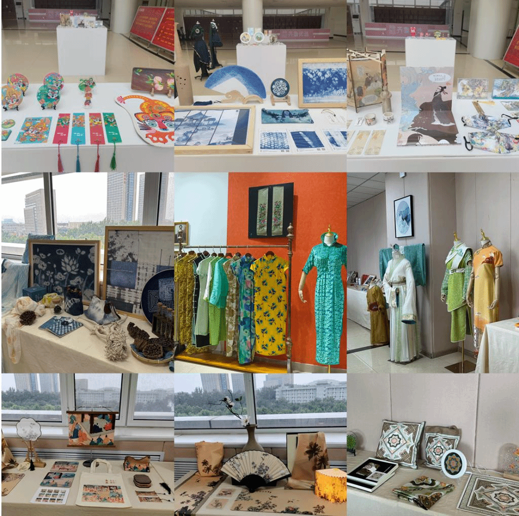 女红文化作为一种民间工艺文化,展现了中华女性自古以来独有的心灵手巧和吃苦耐劳的传统美德。中国传统女红艺术承载了我国几千年的文化与文明,在“黄河国家战略”的引导下,我们提出了“黄河女红的文化传承与保护”行动。学院设立了多间传统女红工作室,服务于教学、科研、产品研发、创新创业等人才培养工作。2022年我院的“黄河女红工作坊”获批了山东省首届大学生艺术团项目。此次中国传统女红艺术作品展是我院师生共同参与制作的手工艺品,融合了中国几千年来的文化内涵。展览中呈现的传统旗袍、盘扣、刺绣、古代配饰、制香、手工扎蜡染、青花瓷等作品,以及融合传统元素和工艺创作的文创产品,无不彰显了对中国传统艺术的传承和对中国文化精神的弘扬。考察团对此次展览表达了高度的赞赏和赞许之词。