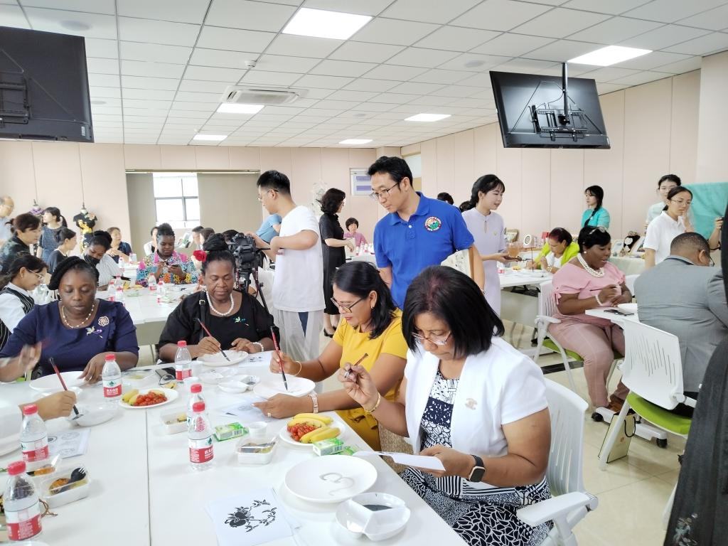 考察团还观看我院学生传统文化节目表演,参观了扎染、旗袍等中华优秀传统文化工作室,体验了茶艺、青花瓷绘制等中国传统文化艺术。