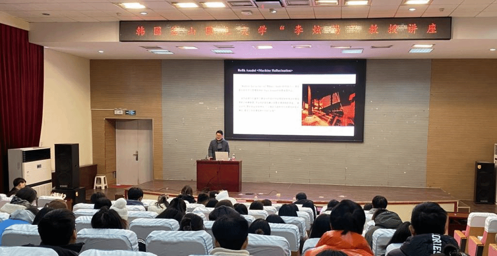 李炫锡教授的讲座从媒体艺术的概念及类型、沉浸的理论及分类、新媒体艺术的应用与发展、数据可视化沉浸式媒体艺术的特点等方面对新媒体艺术进行了全面深入的解读。李教授尤其强调了“数据艺术化”及“AI与媒体艺术结合”所带来的媒体艺术表达方式及应用领域的创新与发展,其分析的多个国家的数据视觉化沉浸式媒体艺术应用案例,让聆听讲座的同学深刻感受到了新形态沉浸式媒体艺术的强大感染力和震撼力。