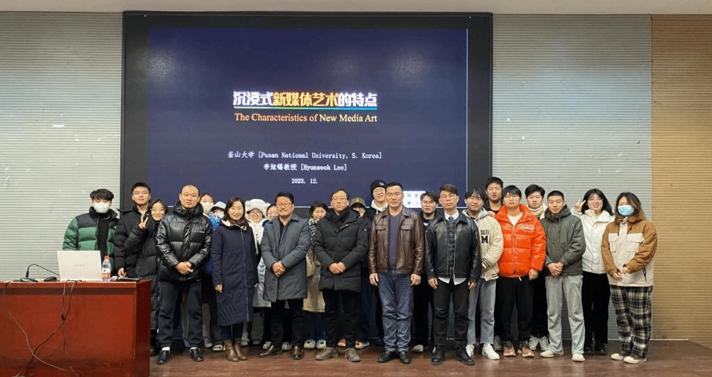 12月22日上午,在图书馆一楼报告厅,韩国釜山国立大学设计系李炫锡教授为师生举行了一场题为《沉浸式新媒体艺术的特点》的学术讲座,潍坊科技学院艺术学院姜亦金院长、张春亮副教授随其来访。数字媒体艺术专业师生100余人聆听了讲座,刘振宇博士担任了韩语翻译,艺术设计学院赵崇立副院长主持了此次活动。