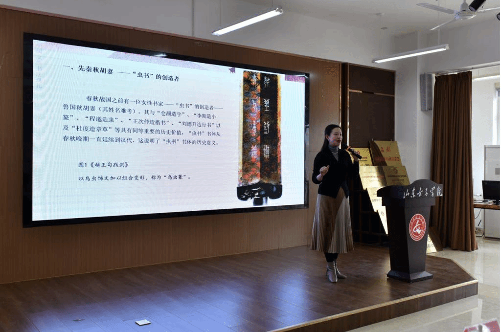 开幕式由艺术设计学院副院长赵崇立主持。活动第一阶段,高远副教授为此次活动作了专题讲座——《中国女性书法巡礼》。高教授讲述了各个朝代具有代表性的优秀女性书法大家,对她们不亚于男子的书法造诣和文墨情怀娓娓道来。她说到,书法在古代是文人士大夫书斋生活和修身养性的一种重要方式,由于历史的局限,女性往往少有机会问津诗书翰墨,然而,随着社会发展与时代变革,越来越多的女性研习书法并在书坛崭露头角,在第114个“三八”国际妇女节来临之际,高教授对新时代下女性书法家秉承中国女性优秀精神品格,以自信、昂扬、乐观、包容、创新的精神风貌,创造中国女性书法艺术新的时代辉煌寄予厚望。