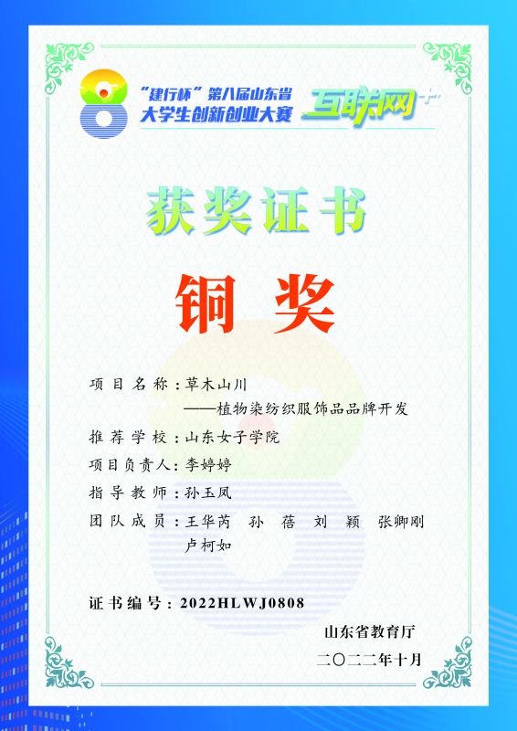 5. 2021.08,参加由山东省妇联、教育厅、工业厅、信息化厅、人力资源社会保障厅、旅游厅、省乡村振兴局共同主办,中国建设银行山东省分行协办的“建行杯”山东省首届妇女手工创业创新大赛,荣获优胜奖。
